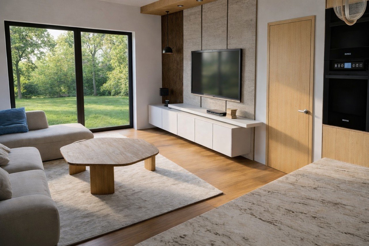 Za vstupními dveřmi je zádveří s možností vestavěných skříní, dále vstupní chodba, technická místnost s prostorem pro pračku a sušičku, koupelna se sprchovým koutem a WC, dále oddělené WC, tři ložnice, pracovna a obývací pokoj s kuchyňským koutem s prosklenými dveřmi se vstupem na terasu a zahradu.
